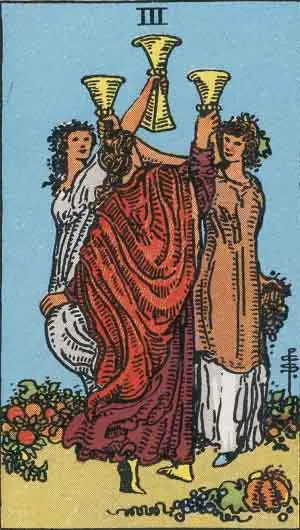 The III of Cups in its upright position often represents emotional abundance and inner happiness. It encourages you to embrace your emotional self, to be open to giving and receiving love, and to nurture your emotional bonds.