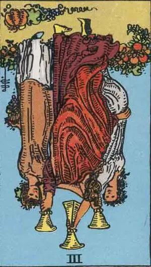First, let’s briefly touch on the upright III of Cups. Depicting three figures joyously raising their cups, it is a card of celebration, community, and togetherness. The energy is brimming with happiness, friendships, and shared successes.